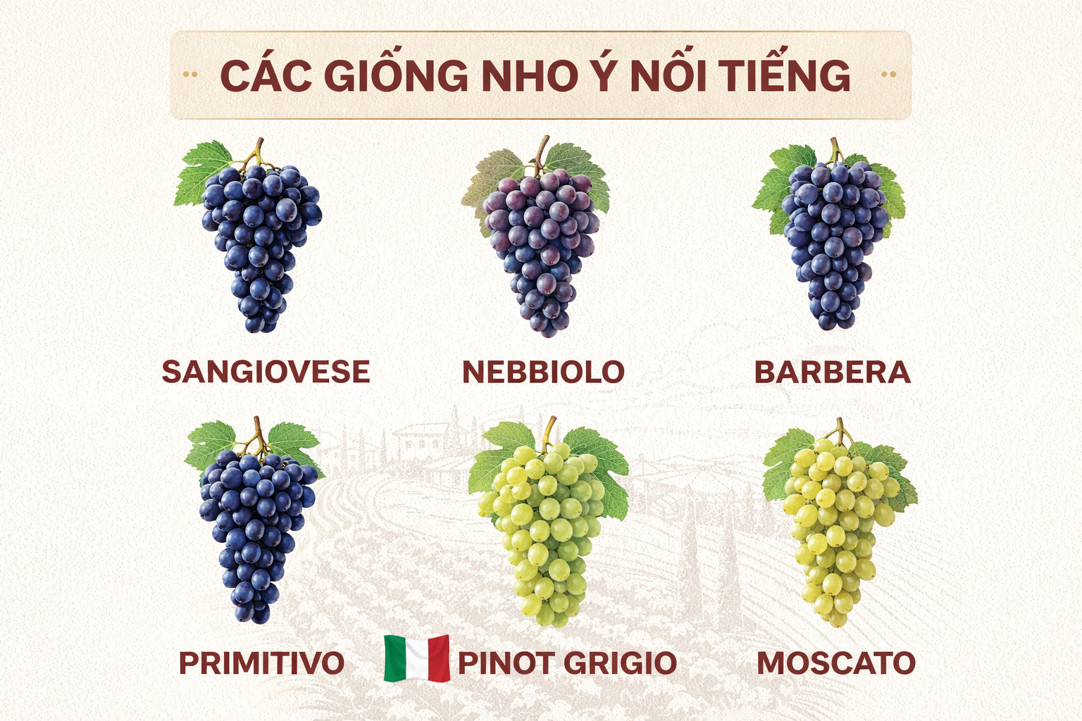 Sử dụng giống nho bản địa đặc trưng như Sangiovese, Nebbiolo, Barbera, Primitivo…